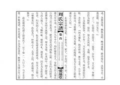 · 提 要湛字文淵登真宗咸平四年辛丑進士誥授諫議大夫宋太祖太平興國元年丙子生慶歷八年戊子卒壽七十有二陪開寶元年戊辰科進士宋維公女同庚例贈夫人誥封安人寶元元年戊寅卒合葬金陵城南主穴。卷首: 譜序;卷一:題詞、周氏族人分布圖、東荷花塘東周村概述、續修宗譜光前裕后、追宗尋根考記、常州武進周姓考略、人物春秋;卷二:周氏原始考、老譜舊序、題詞、譜贊、例言、凡例、紀年對照表;卷三:周氏圖騰及釋義、奉天敕命及誥敕、先祖像贊、祠堂記、墓圖、濂溪年譜、喪服圖;卷四:老譜人物傳、序、記、墓志銘、老譜領譜編號;卷五:老譜行實、行狀、記、詩詞;卷六、七、八、九、十、十一、十二:前述、詩詞、遺訓、題詞、陶家村概述、周吳村概述、各房支世系圖、表。