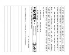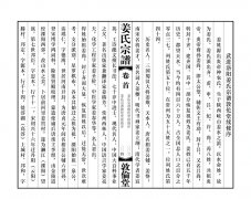 · 提  要得姓始祖姜尚,封于齊而大顯。恢復祖姓以后,遷徙無常,世次難考,支分派別,星羅棋布,各本其始遷之祖為祖 武進洛陽始遷祖昌化公,字宗隆,一泉公十四世孫,,生于元末明初,明永樂二年卒。洪武間由溧陽姜笪村徙居郡東四十里安尚鄉(今洛陽鎮安橋村委)之宙字岸村卷一:卷首、圖騰、姜氏宗譜編修序、偉人論譜、題詞、族人分布圖、人物傳、人物簡介、譜序、像贊、 墟墓誌、八景小引、八景詩卷二:姜氏得姓源流總擴圖、宗祠碑記、家規祠規、宗訓宗約、傳略、墓志銘、卷三卷四:先祖傳序卷五六七八:遠祖世系各分支世系世表、遠祖源流世考。